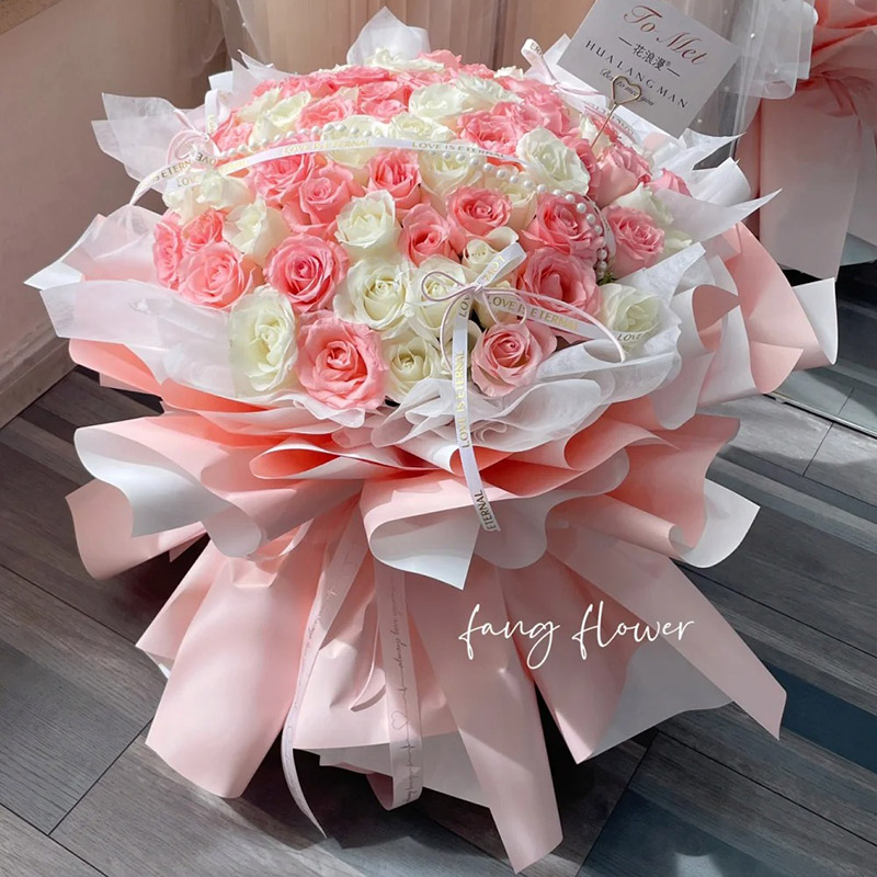 花材: 99朵玫瑰混搭(白玫瑰、粉玫瑰占一半),1条珠串,3只蝴蝶结、1条白色缎带装饰花面。
