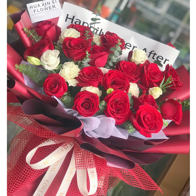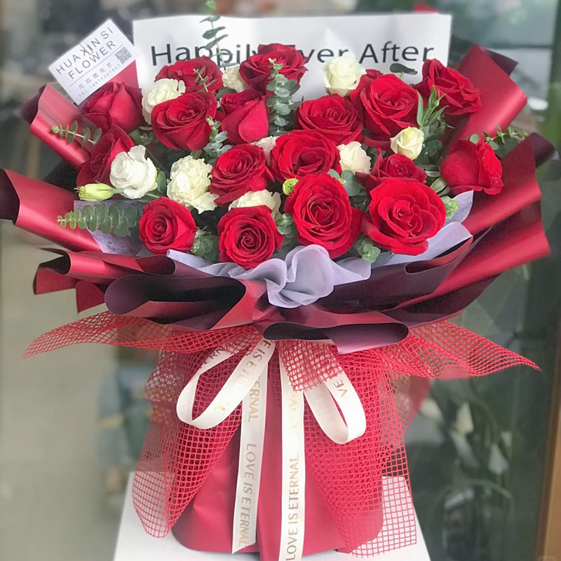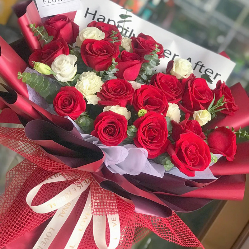 花材: 19朵红玫瑰,5支洋桔梗(断货则用5朵白玫瑰代替),尤加利叶间插。
