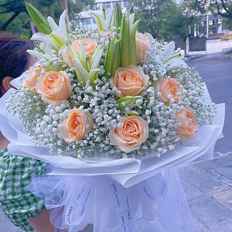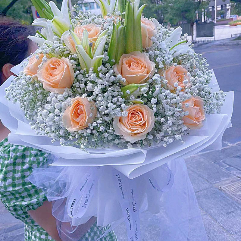 花材: 11朵香槟玫瑰,4支白色多头香水百合,搭配白色满天星丰满间插,尖角造型。