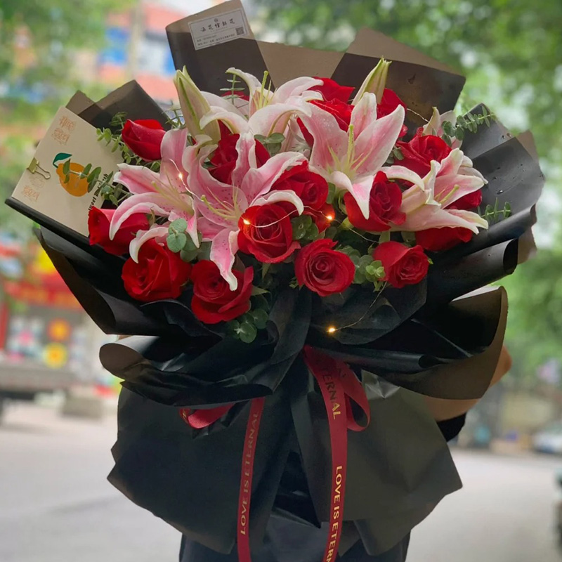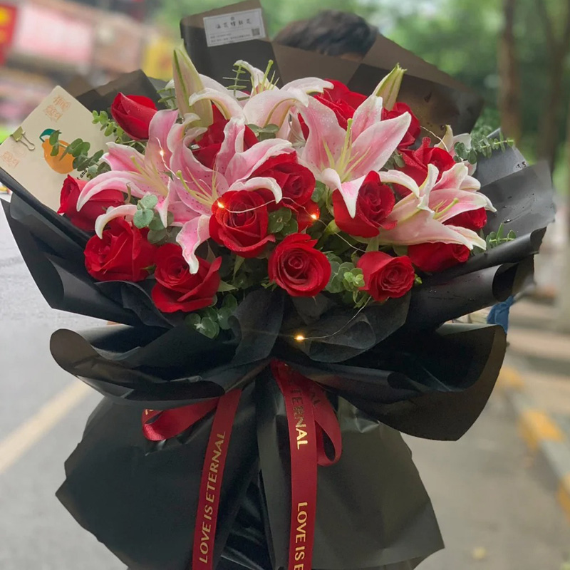 花材: 19朵红玫瑰,2支粉色多头香水百合,1条灯带,搭配尤加利叶装饰。