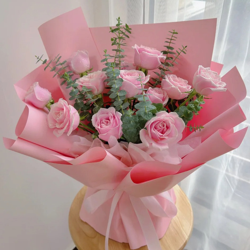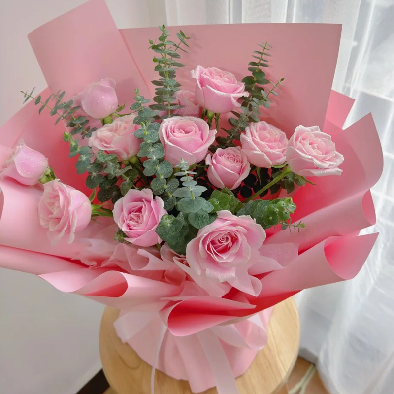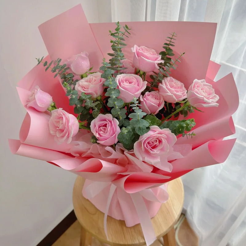 花 材:11朵粉玫瑰,尤加利叶装饰。