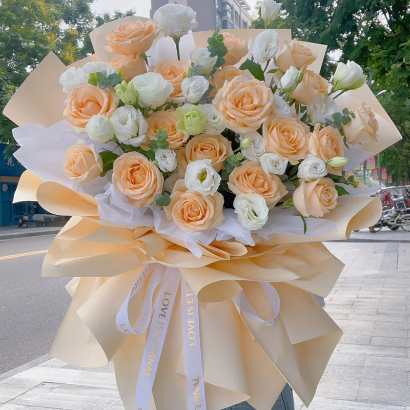花 材:19支香槟玫瑰,搭配10支白色洋桔梗(断货则用12支白玫瑰代替),尤加利叶装饰。