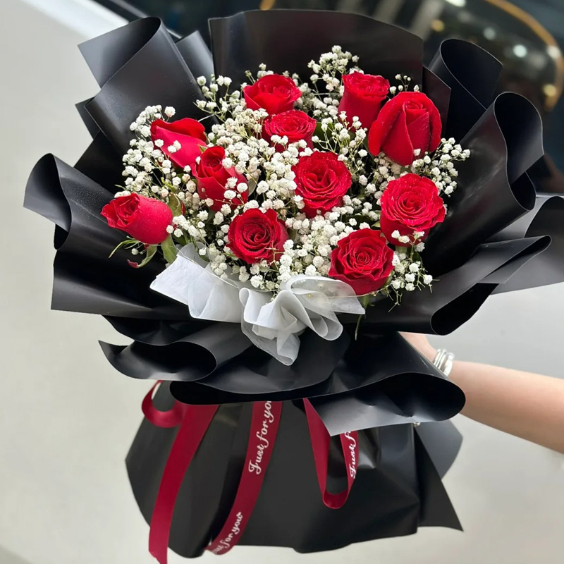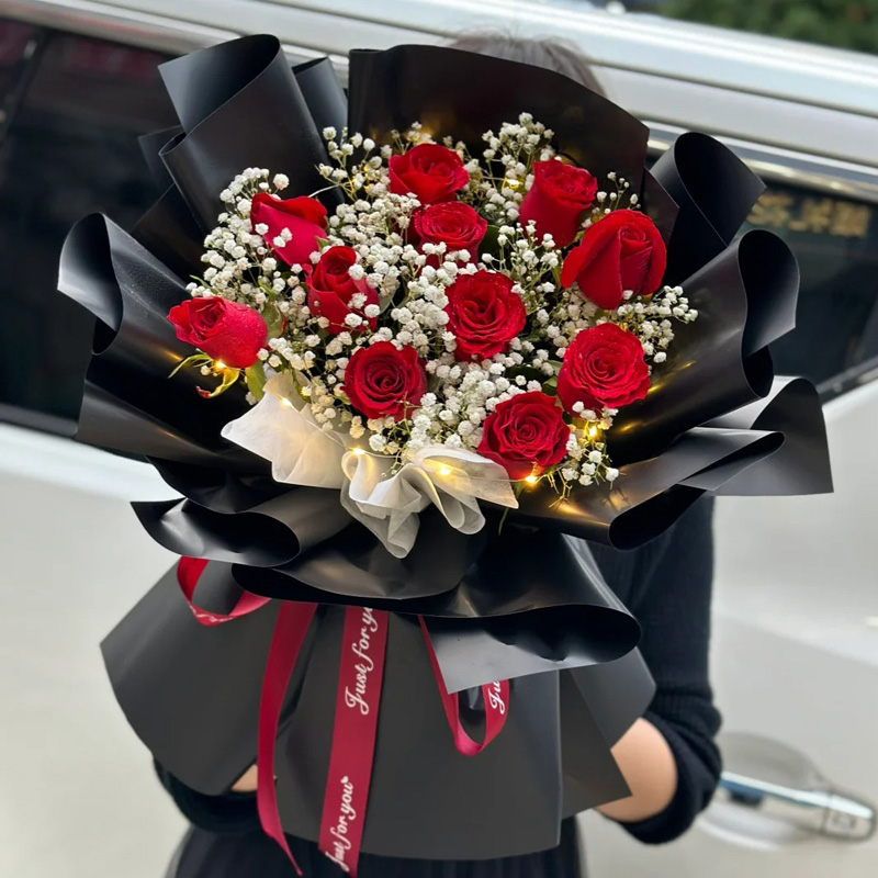 花材: 11朵红玫瑰,1条灯带,满天星间插。