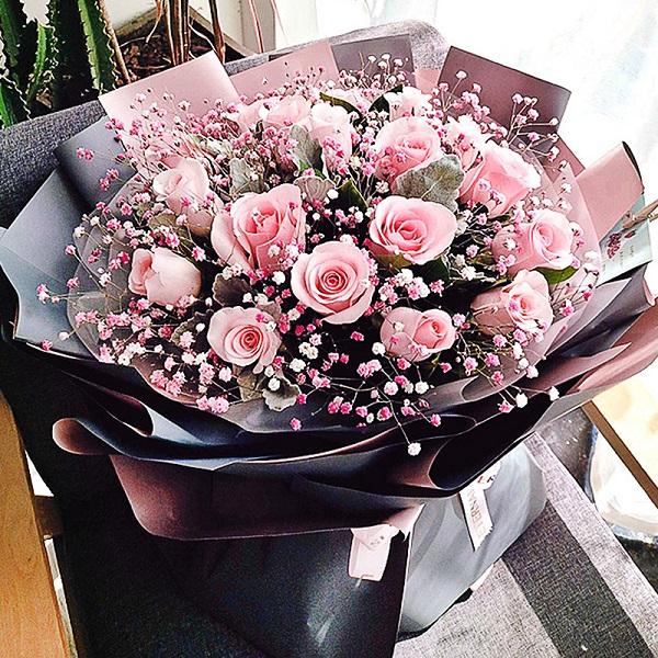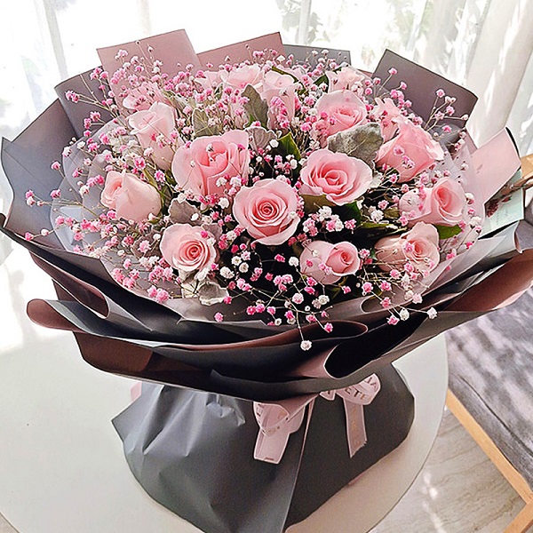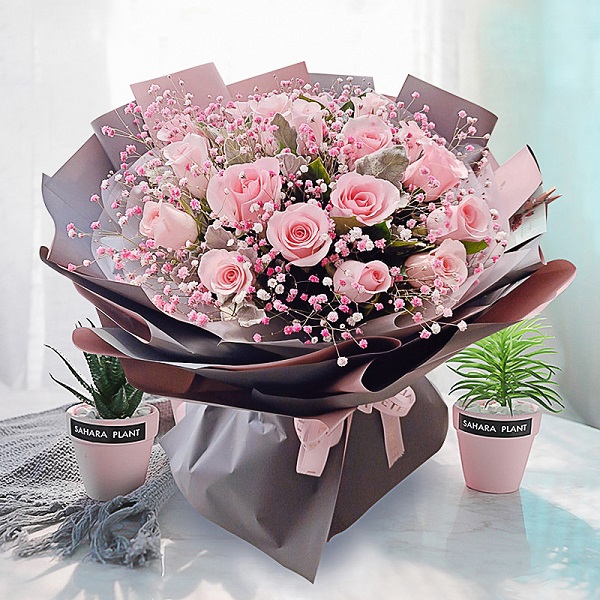 花 材: 19朵戴安娜粉玫瑰,粉色满天星点缀,银叶菊搭配