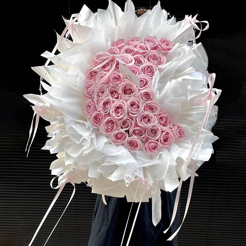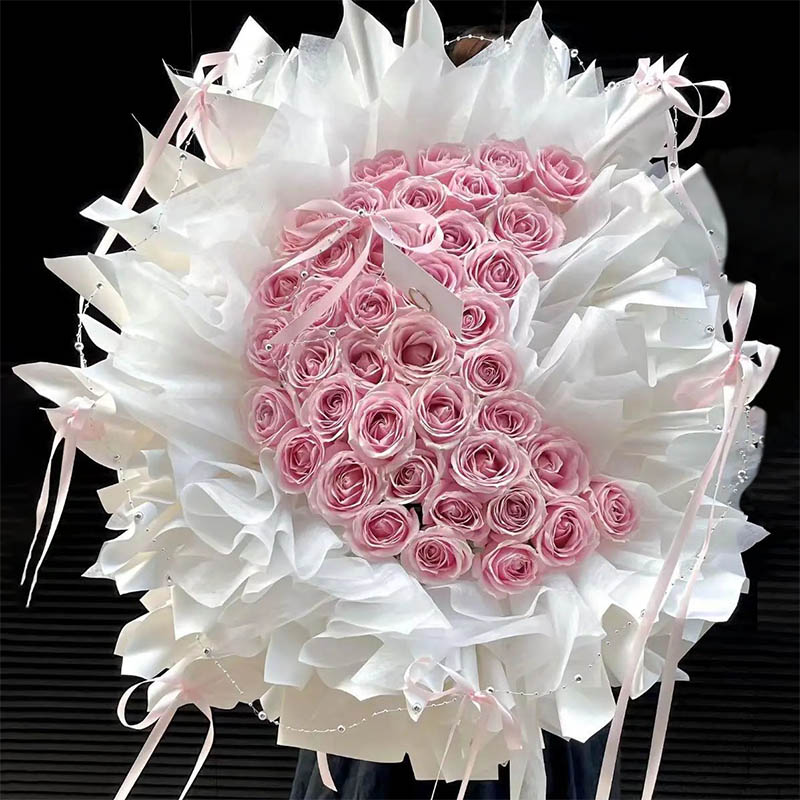 花 材:39朵粉玫瑰月亮造型(可根据花朵开放程度增加粉玫瑰保证造型,不低于39朵),1条粉色蝴蝶结装饰花面。