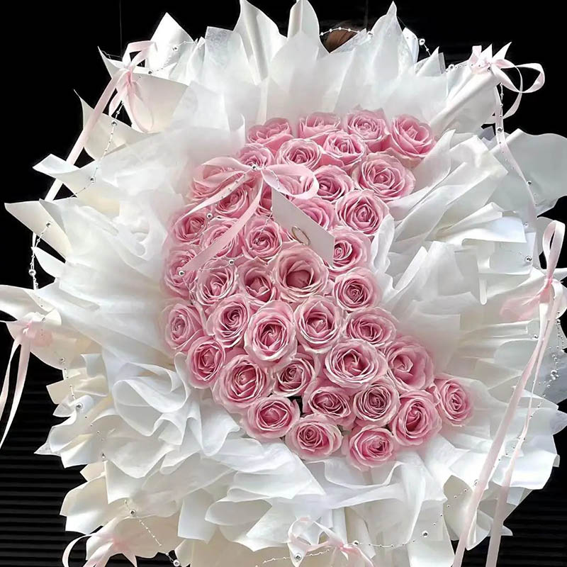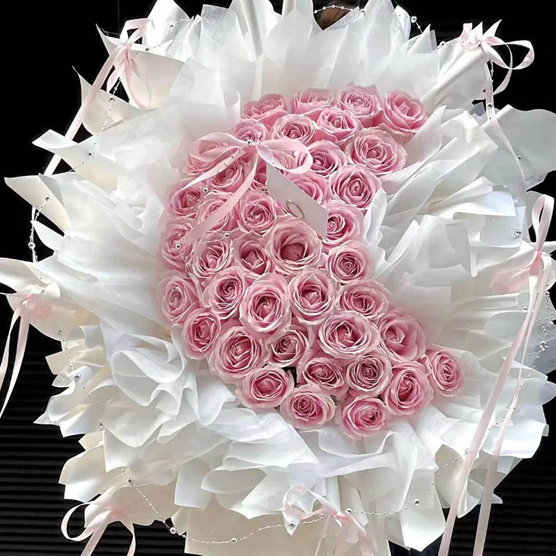 花材: 39朵粉玫瑰月亮造型(可根据花朵开放程度增加粉玫瑰保证造型,不低于39朵),1条粉色蝴蝶结装饰花面。