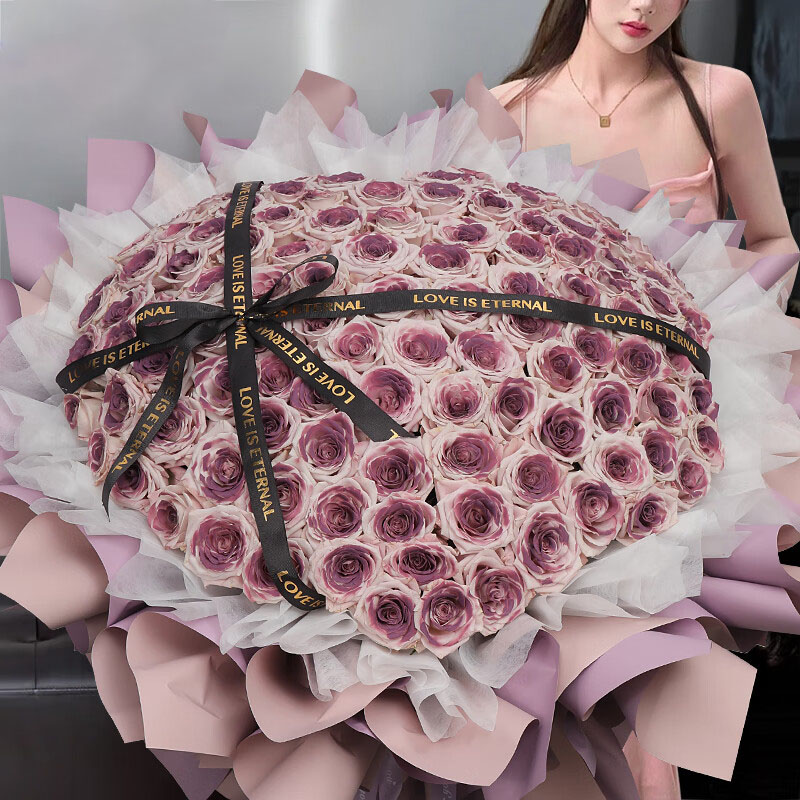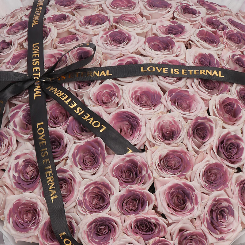 花材: 99朵曼塔喷色乌梅子酱花束,黑色缎带做花结装饰花面。(珍贵稀少花材,请提前预订或咨询花艺师)
