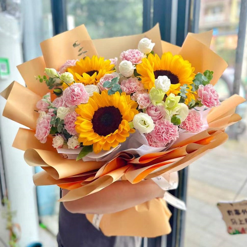 花 材:精选3支向日葵,19朵粉色康乃馨、粉玫瑰混搭,4支洋桔梗,搭配尤加利叶装饰。