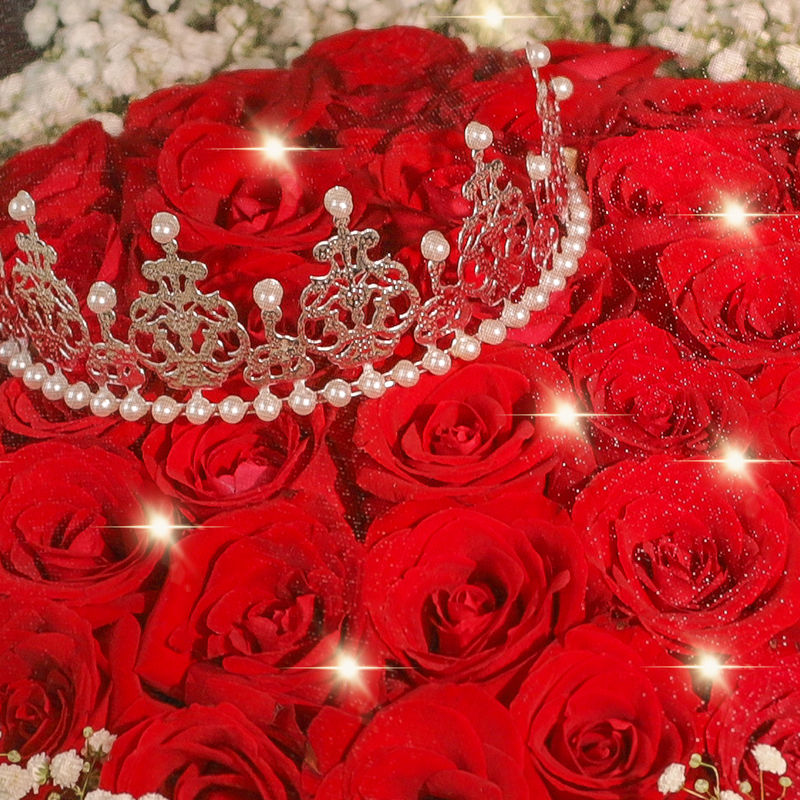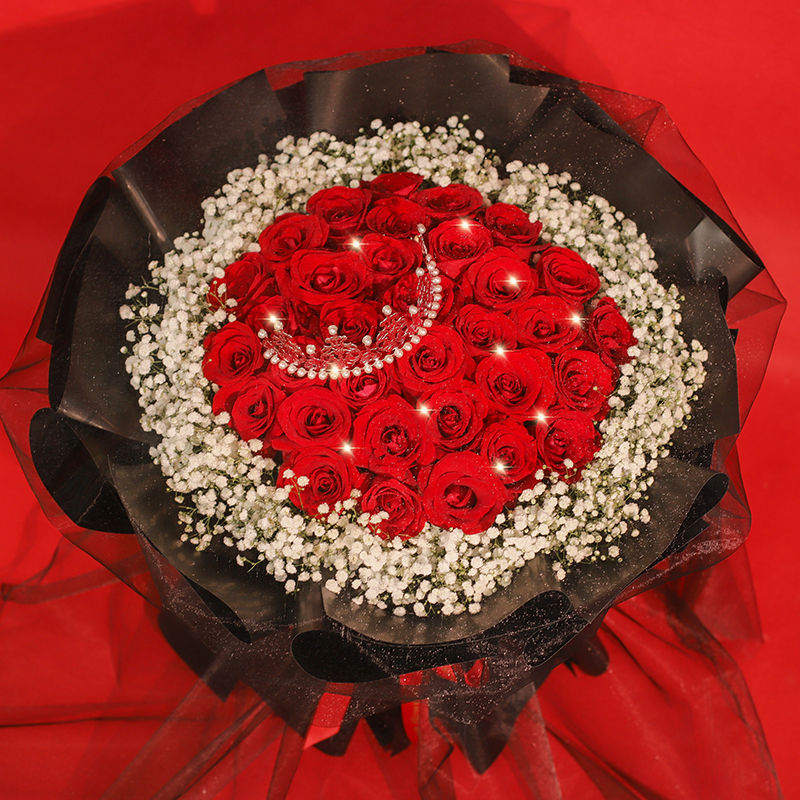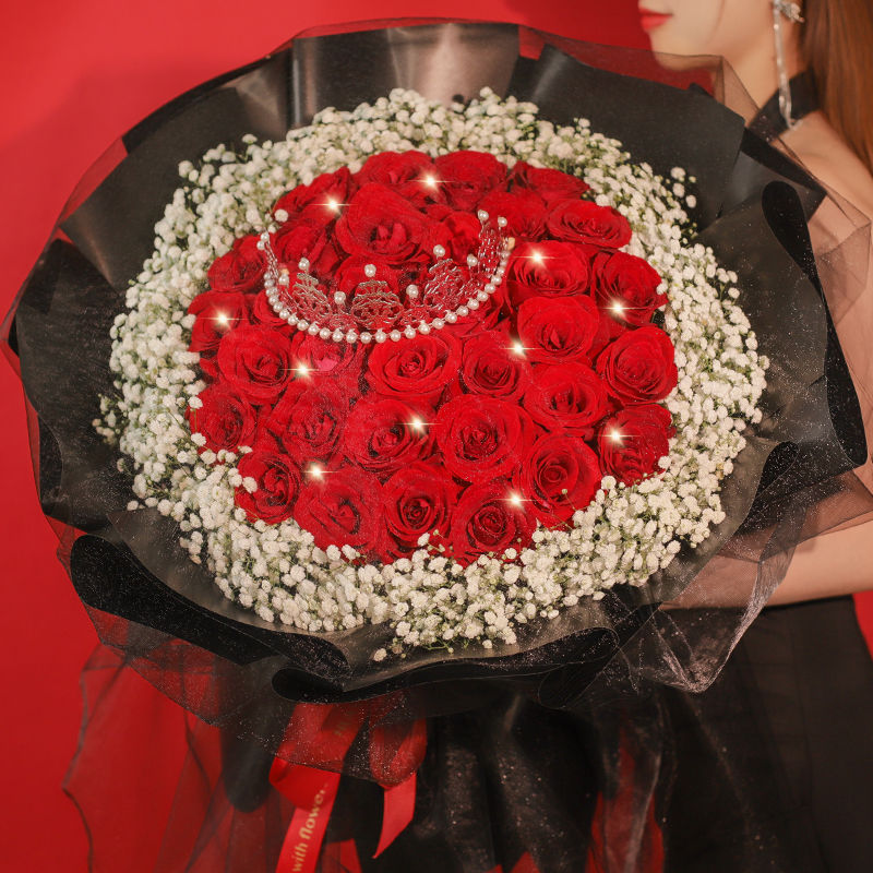花材: 33枝红玫瑰搭配白色满天星环绕、1个皇冠(款式随机)、1条串灯。