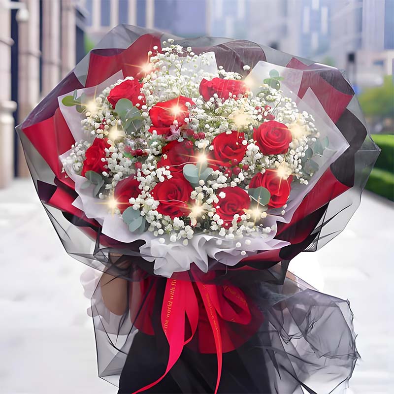 花材: 11朵卡罗拉红玫瑰,表面一串彩灯装饰,搭配白色满天星、红豆,尤加利叶丰满间插。