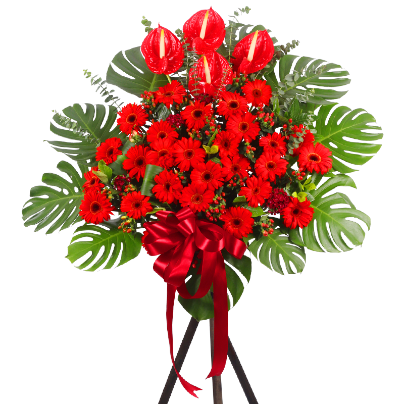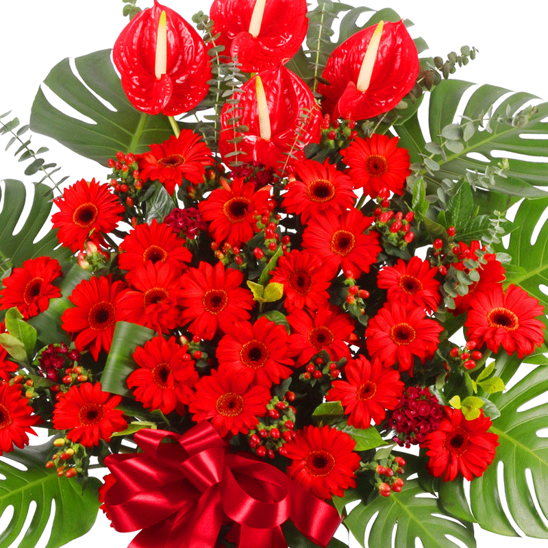 财旺运旺 - 红色扶郎花25朵,红掌4朵,搭配适量红豆、红相思梅、尤加利叶、栀子叶、龟背叶。