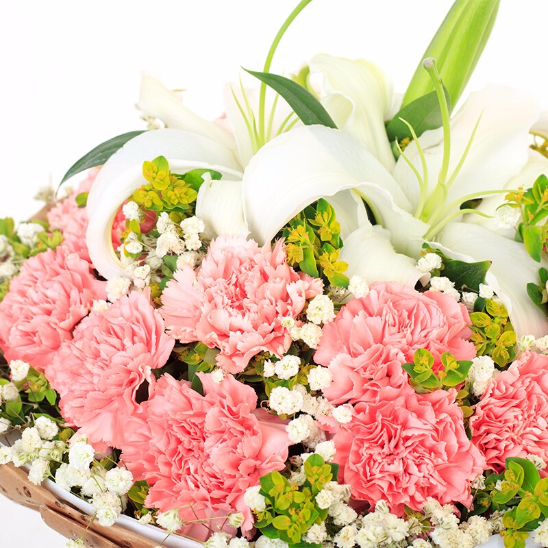- 花材19朵粉色康乃馨,1枝香水百合,搭配满天星。