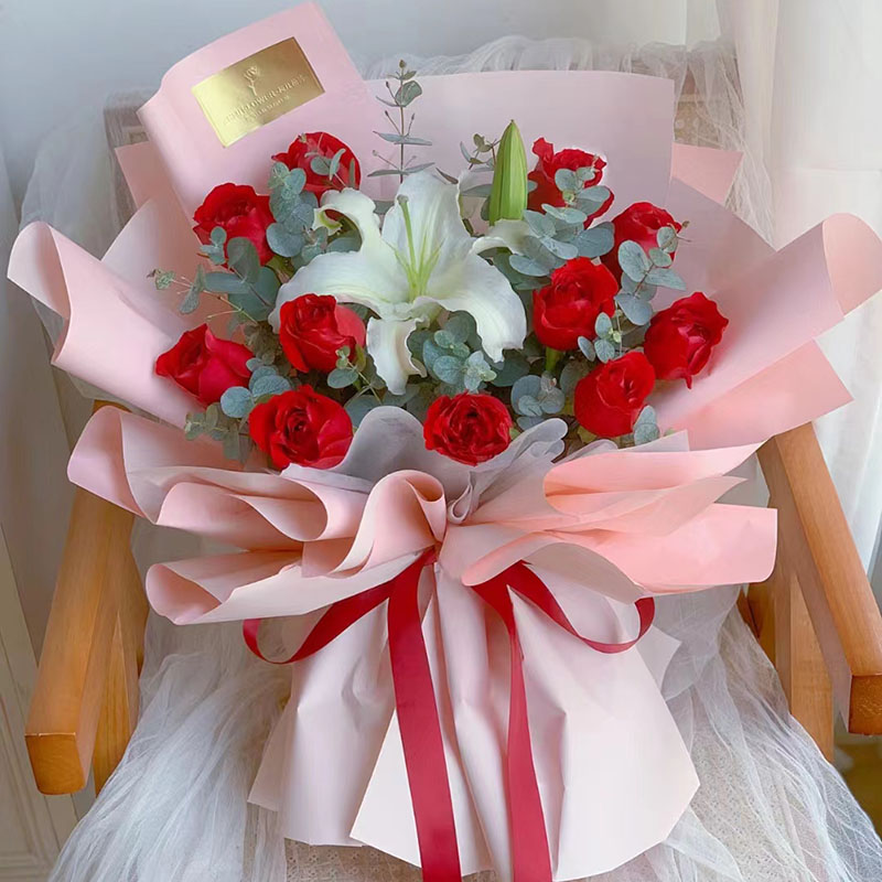 - 花材11朵红玫瑰,1支多头白色香水百合,搭配尤加利叶装饰。