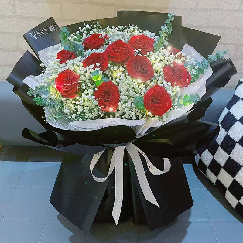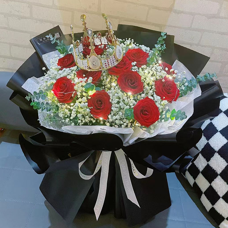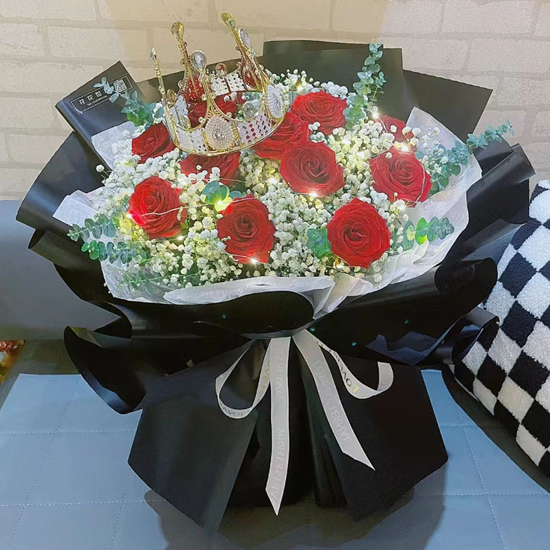 • 花材11朵红玫瑰,1条灯带,1个皇冠(样式随机),搭配满天星、尤加利叶装饰。