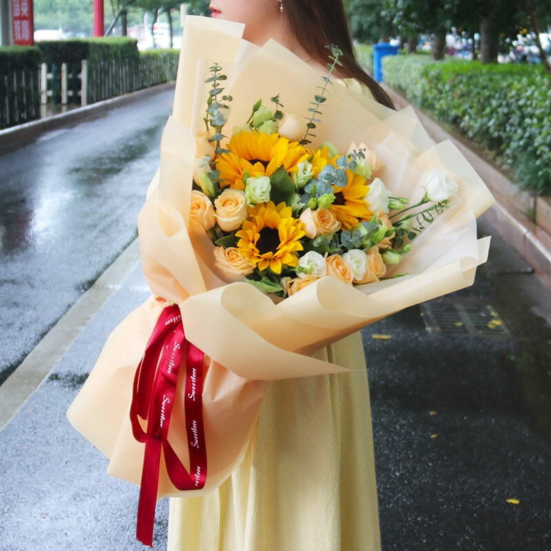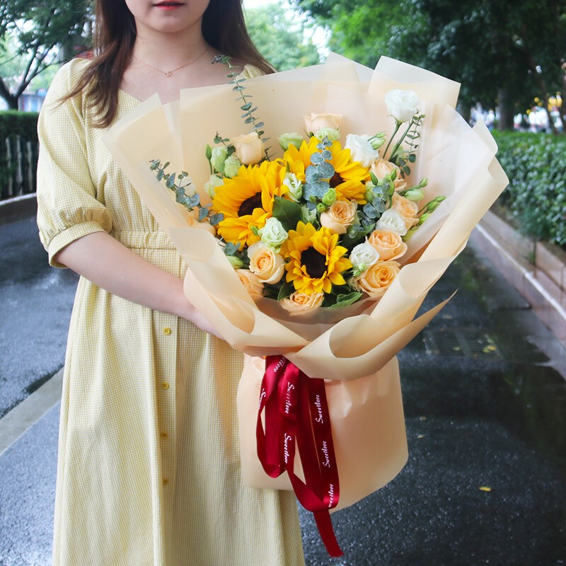 稍尽春风 - 19朵香槟玫瑰、3支向日葵,搭配4支洋桔梗、尤加利叶装饰。