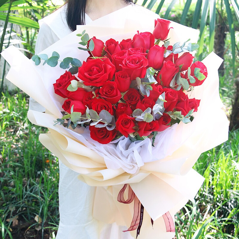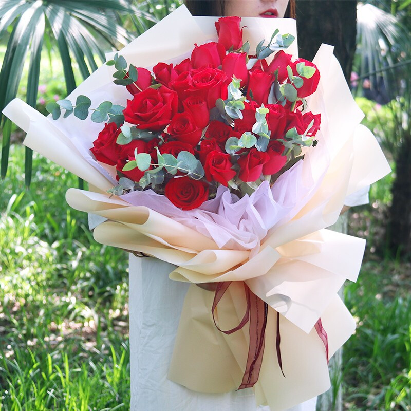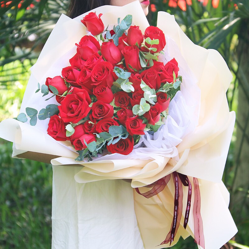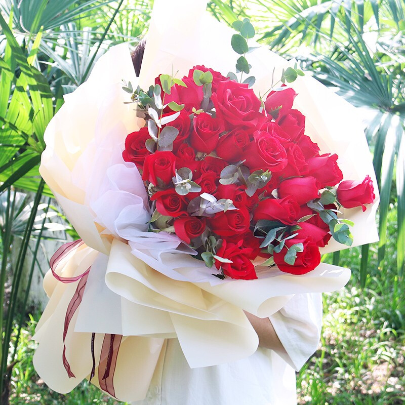 • 花材33朵红玫瑰,尤加利叶装饰。