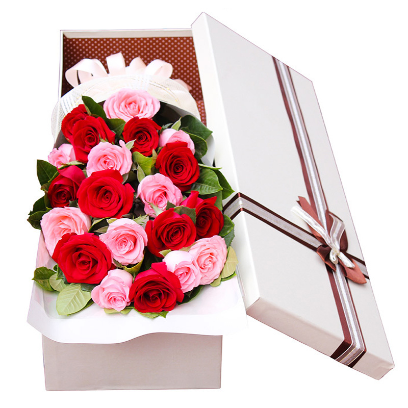 • 花材精选19朵混搭玫瑰(11朵红玫瑰、8朵粉玫瑰),搭配栀子叶等绿叶装饰。