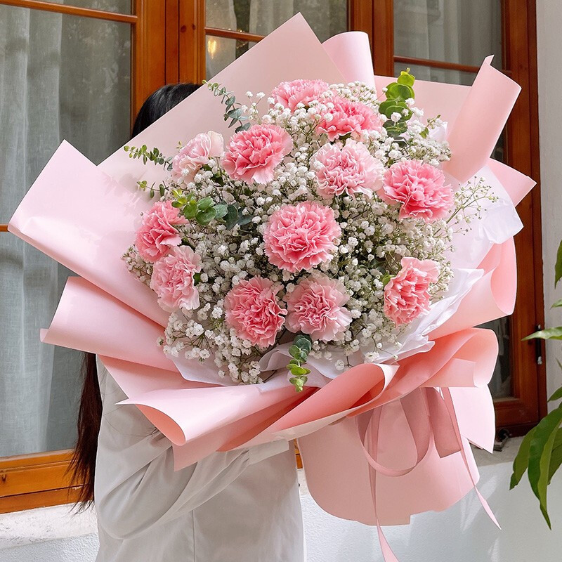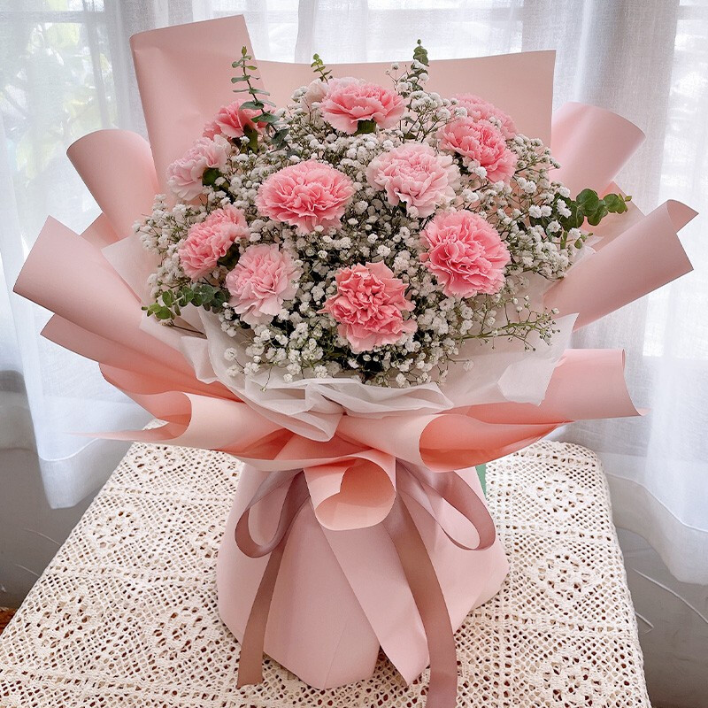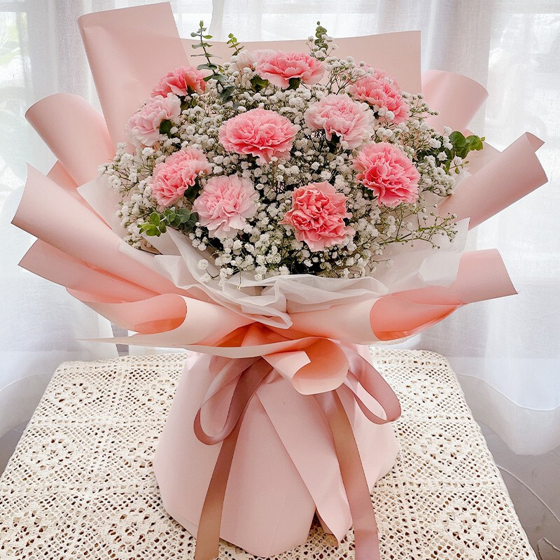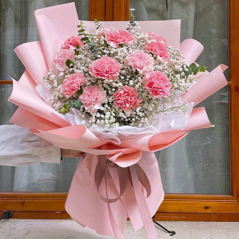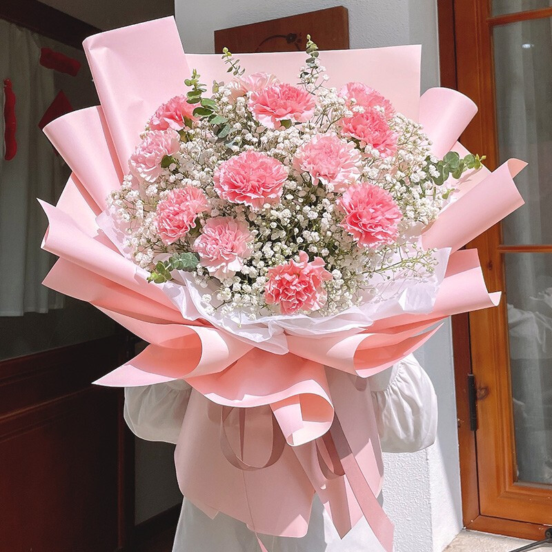 • 花材精选12朵粉色康乃馨,尤加利叶、大量白色满天星装饰。