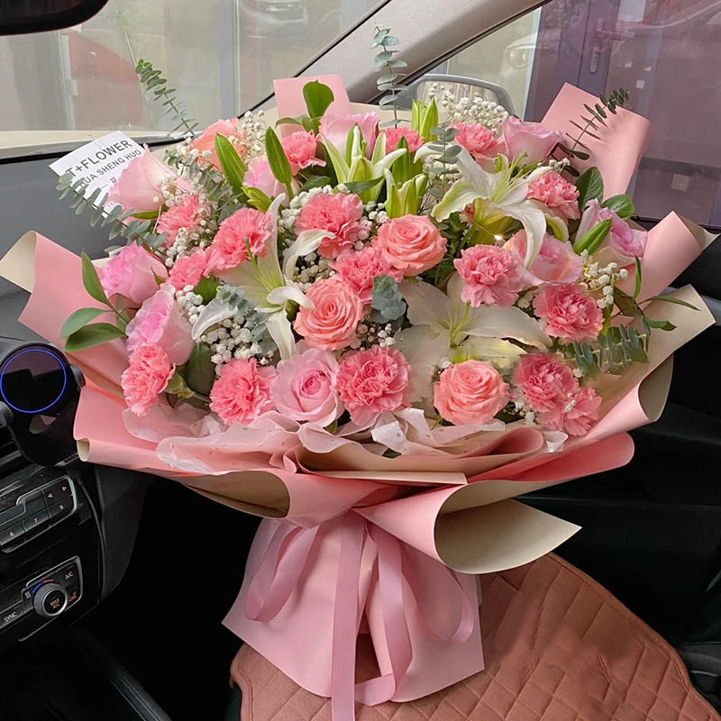• 花材28朵粉色康乃馨、粉玫瑰混搭,4支多头白色香水百合,搭配尤加利叶、满天星装饰。
