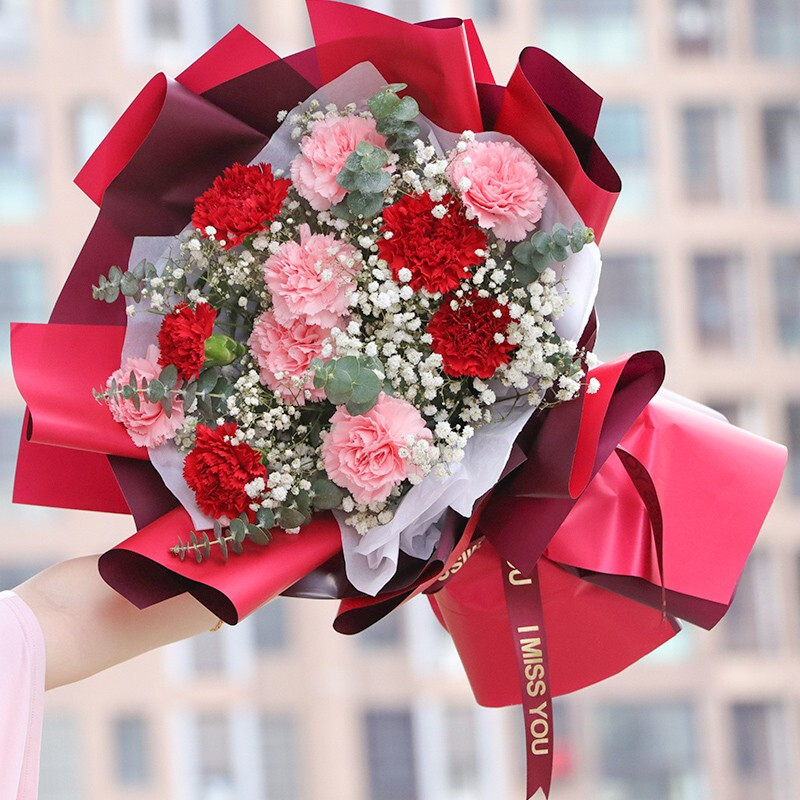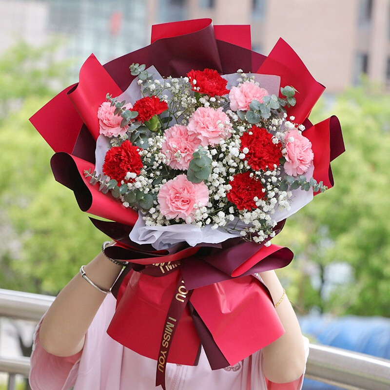 无尽的思念 - 11朵康乃馨混搭(红色5朵,粉色6朵),白色满天星间插,尤加利点缀。