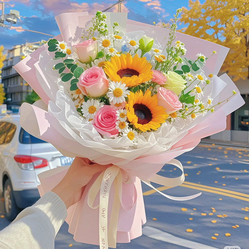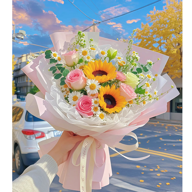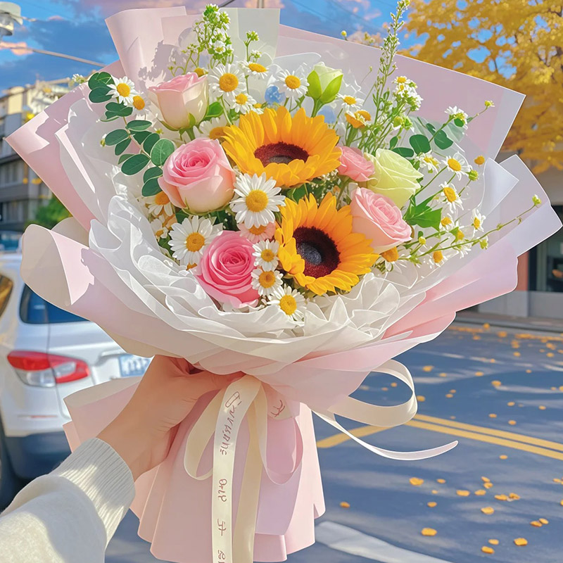 光芒万丈 - 精选2支向日葵,5支戴安娜粉玫瑰,1支洋桔梗,搭配洋甘菊、尤加利叶装饰。