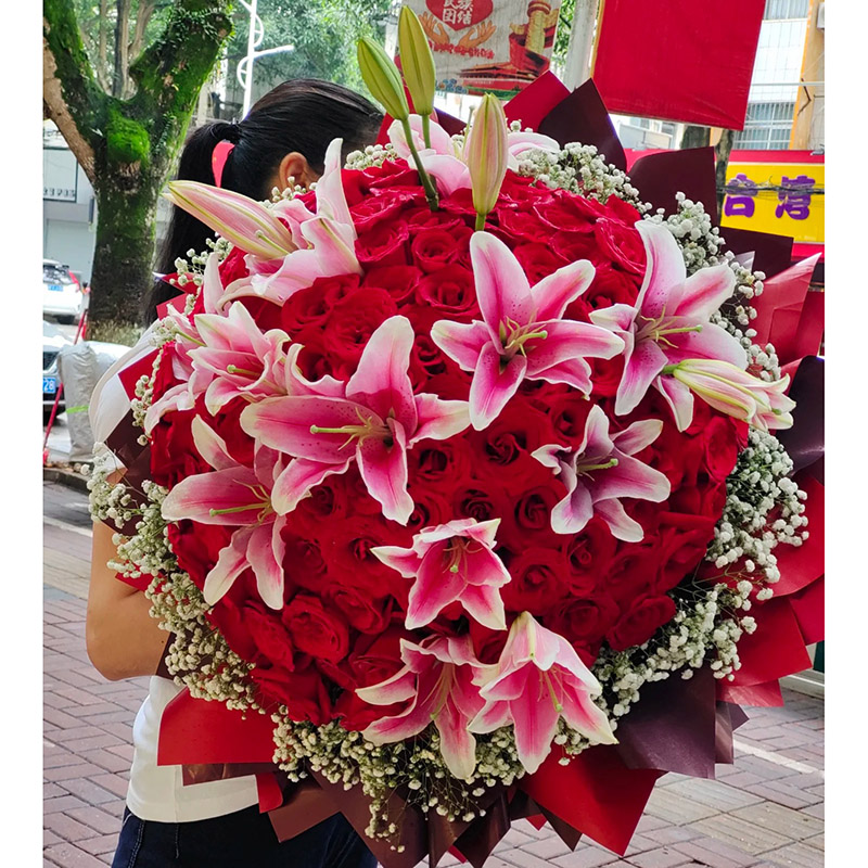 • 花材精选99朵红玫瑰,7支多头粉色香水百合,满天星环绕装饰。