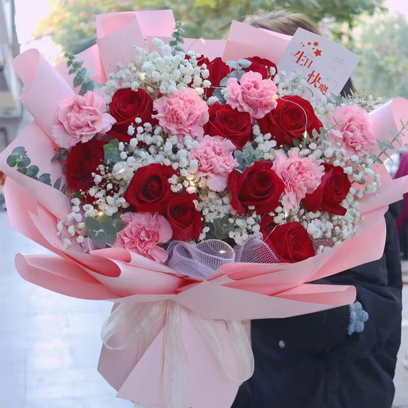 • 花材19朵红玫瑰、粉色康乃馨混搭(11朵红玫瑰、8朵粉色康乃馨),1条灯带,搭配满天星、尤加利叶装饰。