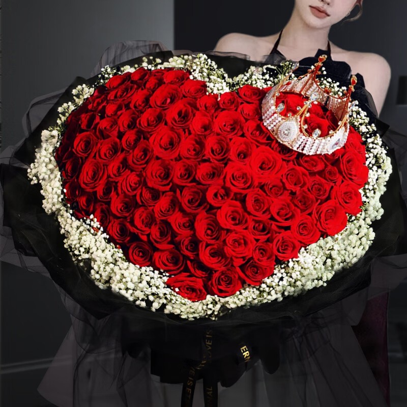 • 花材99支顶级红玫瑰心形造型,1个皇冠(款式随机),满天星环绕。