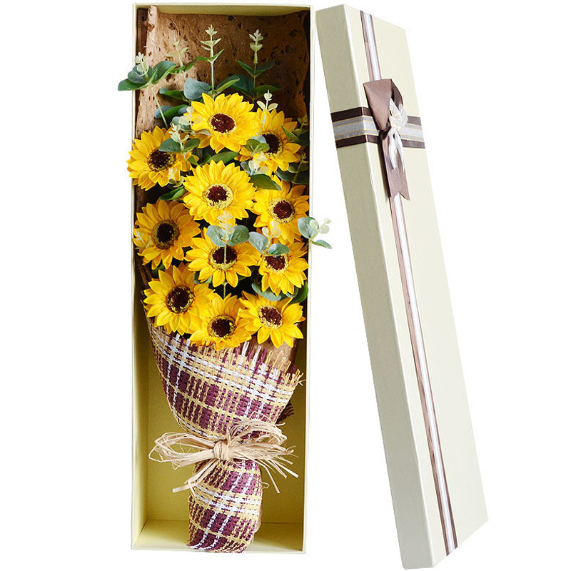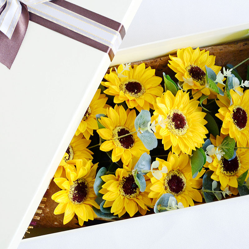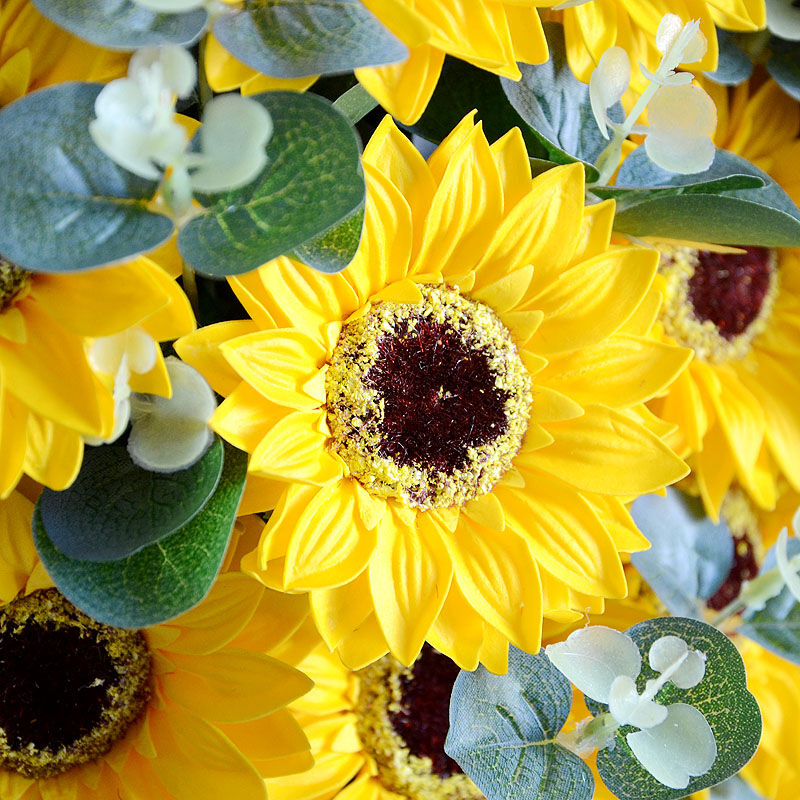 • 花材精选11支向日葵,搭配尤加利叶装饰。